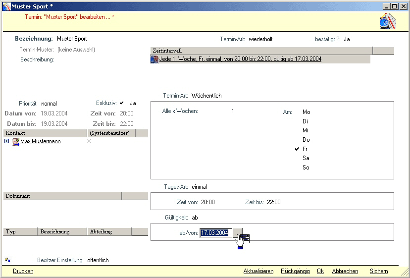Ein Termin kann als Serie mit wiederkehrenden Zeitpunkten definiert werden. Es können mehrere Zeitintervalle bestimmt werden (z.B. Sporttermin Dienstags von 18-20 Uhr und Donnerstags von 19-21 Uhr). |