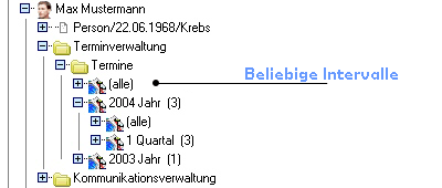 Unterteilung von Termin im Baum in Jahre, Quartale, Monate, Wochen und Tage. |